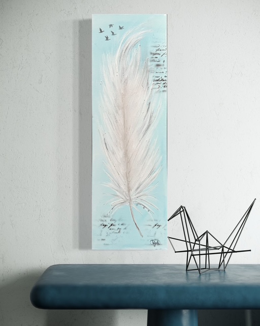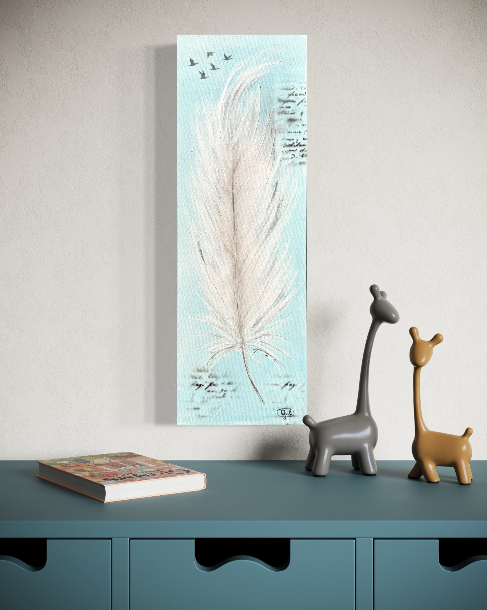 Plume de lumière évoque un souffle léger, un instant suspendu, comme si le temps ralentissait autour d’elle. La plume, douce et aérienne, se détache sur un fond bleu pastel qui inspire calme, pureté et apaisement.