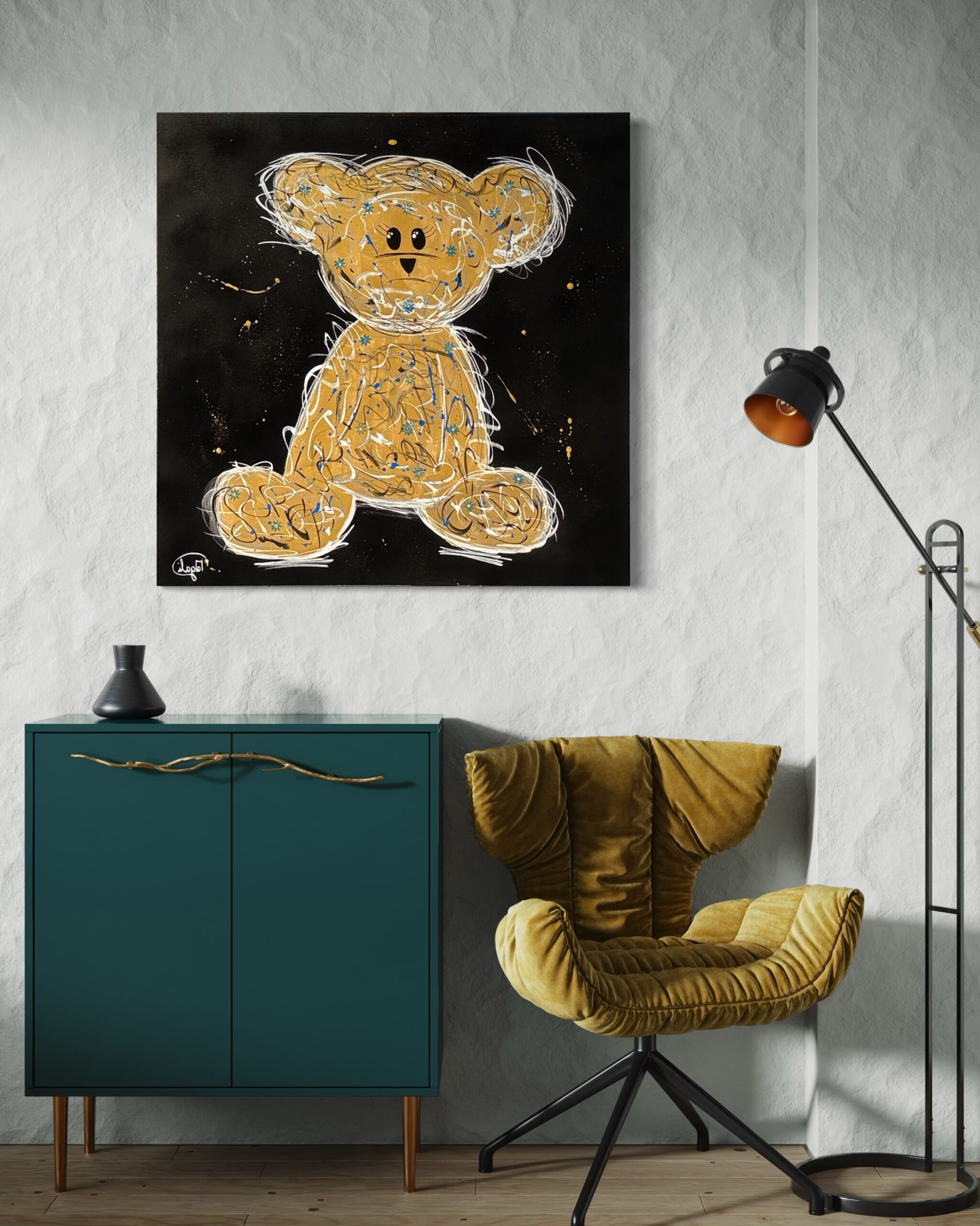 Golden Teddy est une œuvre qui joue avec les contrastes : la douceur de l’ourson face à la puissance du fond noir. Les tons dorés, délicatement relevés par quelques détails bleutés, ainsi que les lignes blanches, donnent vie à un personnage lumineux, presque précieux, comme une petite étoile au milieu de la nuit.